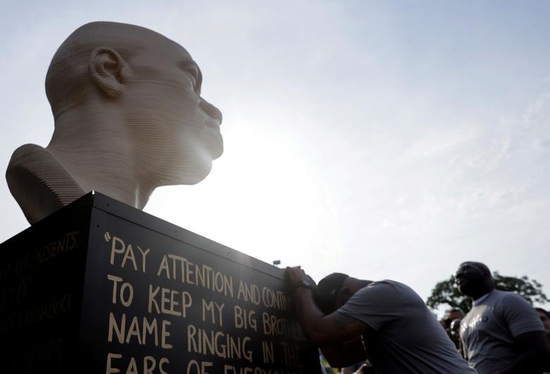 پولیس آفیسر کے ہاتھوں قتل ہونے والے سیاہ فام جارج فلائیڈ کے بھائی ٹیرنس فلائیڈ اپنے بھائی کے مجسمے کے سامنے کھڑے ہو کر جذبات کا اظہار کر رہے ہیں۔