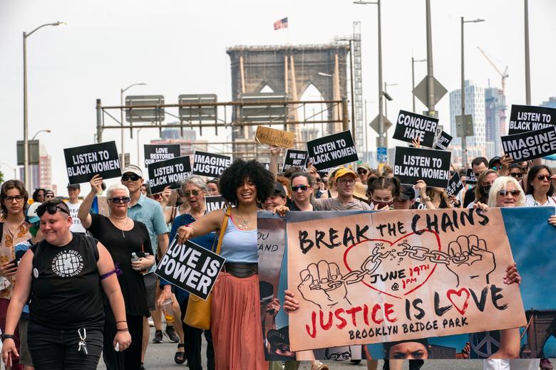 نیویارک شہر میں مارچ کے دوران مظاہرین نے ہاتھوں میں بینرز اور پلے کارڈز اٹھا رکھے ہیں جن پر ’زنجیریں توڑ دو‘، ’سیاہ فام خاتون کی سنو‘ کے نعرے درج ہیں۔