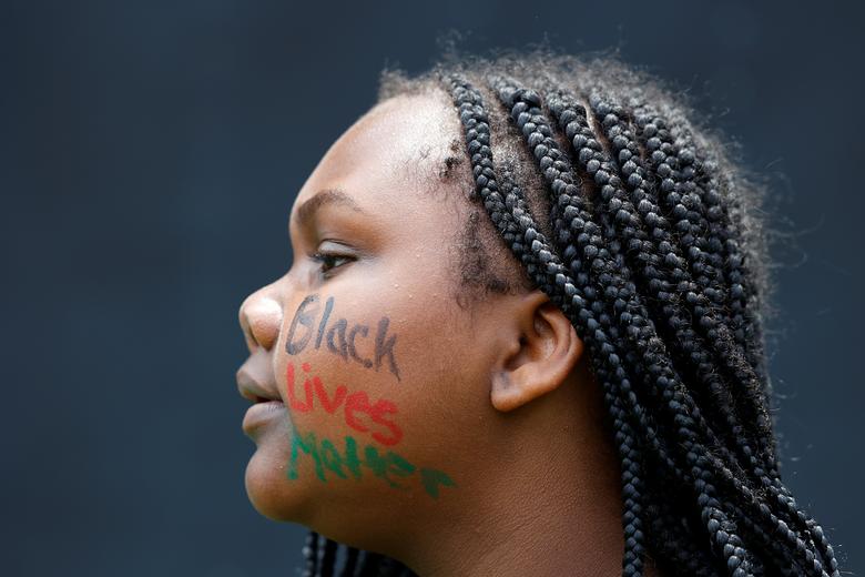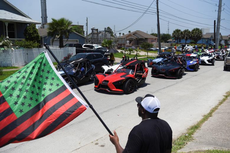 ٹیکساس کے علاقے گیلوسٹن میں ایک شخص افریقی رنگوں سے مزین امریکی جھنڈا تھامے کھڑا ہے۔