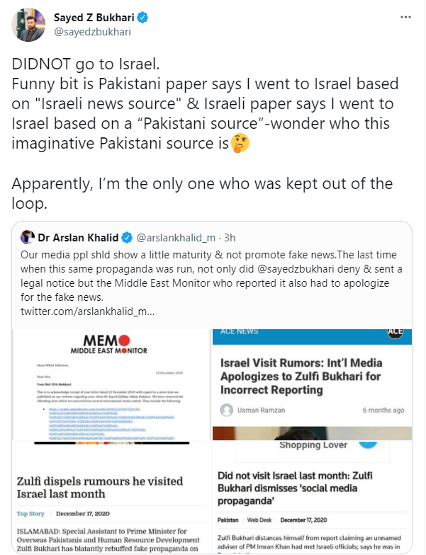 زلفی بخاری نے ٹویٹ کیا کہ ’یہ مضحکہ بات یہ ہے کہ پاکستانی اخبار اسرائیل جانے کی خبر ’اسرائیلی خبروں کے ذریعہ‘ اور اسرائیلی اخبار نے ’پاکستانی ذریعہ‘ کا حوالہ دیا ہے۔‘