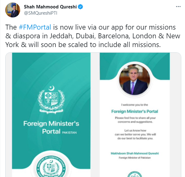وزیرخارجہ کے اکاؤنٹ سے کی گئی ٹویٹ میں سکرین شاٹ شیئر کرتے ہوئے بتایا گیا تھا کہ ’ایم ایف پورٹل جدہ، دبئی، بارسلونا، لندن اور نیویارک کے لیے دستیاب ہے، جلد تمام سفارتی مشنز کے لیے مہیا کر دیا جائے گا۔‘