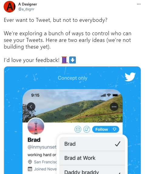 کچھ عرصہ قبل ’ٹویٹ ریپلائز‘ کو محدود کرنے کا فیچر متعارف کرانے والی مائکروبلاگنگ ویب سائٹ ٹوئٹر اب کچھ ایسے فیچرز پر کام کر رہی ہے جس سے ٹویپس طے کر سکیں گے کہ ان کی کون سی ٹویٹ کسے دکھائی دے۔