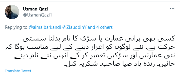 عثمان قاضی نامی صارف کا اس حوالے سے کہنا تھا کہ ’کسی بھی پرانی عمارت یا سڑک کا نام بدلنا سستی حرکت ہے۔ نئے لوگوں کو اعزاز دینے کے لیے مناسب ہوگا کہ نئی عمارتیں اور سڑکیں تعمیر کر کے انہیں نئے نام دیے جائیں۔ زندہ باد ضیا صاحب۔ شکریہ کپل۔‘