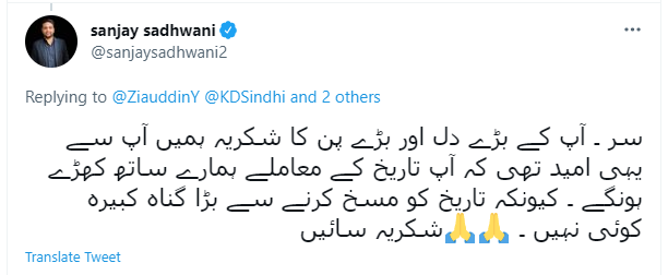 سنجے سدھوانی نے ضیا یوسفزئی کا شکریہ ادا کرتے ہوئے کہا کہ ’ سر آپ کے بڑے دل اور بڑے پن کا شکریہ۔ ہمیں آپ سے یہی امید تھی کہ آپ تاریخ کے معاملے میں ہمارے ساتھ کھڑے ہوں گے۔ کیونکہ تاریخ کو مسخ کرنے سے بڑا گناہ کبیرہ کوئی نہیں۔ شکریہ سائیں‘