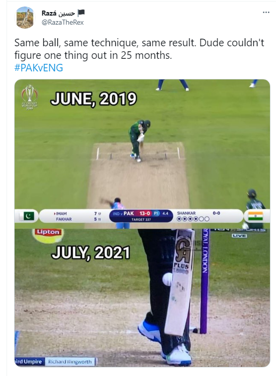 حسنین رضا نے اپنے خیالات کا اظہار 2019 اور آج کے میچ کی ایک ساتھ تصاویر شیئر کرتے ہوئے کہا انہوں نے لکھا ’وہی بال، وہی تکنیک اور وہی ایک ہی نتیجہ، کیا آپ 25 مہینوں میں ایک چیز نہیں ٹھیک کر پائے؟