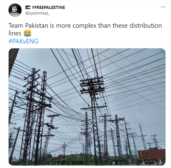 پاکستانی ٹیم کی جانب سے الجھتی صورت حال پر سید ایم تقی کچھ یوں تبصرہ کرتے دکھائی دیے کہ بجلی کی الجھی ہوئی تاروں کی تصویر شیئر کی اور ساتھ لکھا ’پاکستانی ٹیم ان لائنز سے بھی زیادہ پیچیدہ ہے۔‘