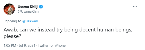 اسامہ خلجی نامی صارف بھی ویریئنٹ کو کسی خاص ملک سے مخصوص کرنے کے مخالف نظر آئے اور انہوں نے ڈاکٹر اواب علوی کو جواب دیتے ہوئے لکھا کہ ’ براہ کرم، کیا ہم اس کے بجائے مہذب انسان بننے کی کوشش کر سکتے ہیں؟‘