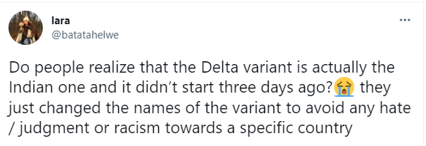 تاہم ویریئنٹ کے حوالے سے لارا نامی صارف نے کہا کہ ’کیا لوگوں کو احساس ہے کہ ڈیلٹا ویریئنٹ اصل میں انڈین ویریئنٹ ہے اور یہ تین دن پہلے شروع نہیں ہوا۔ انہوں نے کسی خاص ملک سے نفرت یا نسلی امتیاز سے بچنے کے لیے ویریئنٹ کے محض ناموں کو تبدیل کیا ہے۔‘