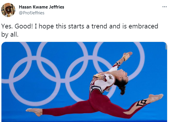 کینیڈا کی سیاسی رہنما رچل نوٹلے نے لکھا کہ ’جرمنی کی خواتین جمناسٹک ٹیم کا بیان پسند آیا۔ یہ دنیا کی بہترین کھلاڑی ہیں، یہ ایسے کرتب دکھاتی ہیں کہ ہم مرعوب ہوجاتے ہیں۔ انہوں نے اپنی زندگیاں کھیل کے لیے وقف کی ہوئی ہیں۔ انہیں وہ عزت دیں جس کی یہ حقدار ہیں۔‘