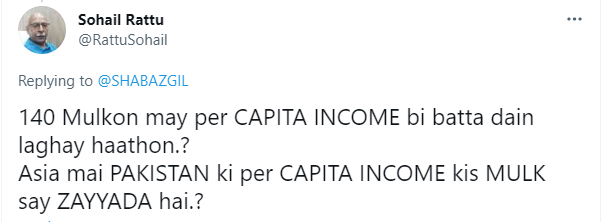 شہباز گل نے دنیا کے 140 ملکوں میں پیٹرول کی قیمت پاکستان سے زیادہ بتائی تھی۔ سہیل رتو نامی صارف نے اپنے ردعمل میں سوال کیا تو لکھا ’140 ملکوں میں فی کس آمدن بھی بتا دیں لگے ہاتھوں۔ ایشیا میں پاکستان کی فی کس آمدن کس ملک سے زیادہ ہے؟‘