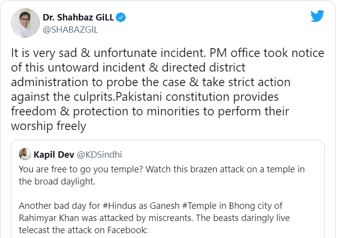 وزیراعظم کے معاون خصوصی شہباز گل نے کپل دیو کی ویڈیو ریٹویٹ کر کے لکھا کہ ’یہ نہایت افسوسناک اور بدقسمت واقعہ ہے۔ وزیراعظم کے دفتر نے اس واقعے کا نوٹس لیا ہے اور ضلعی انتظامیہ کو معاملے کی تفتیش اور ملزمان کے خلاف سخت کارروائی کی ہدایت کی ہے۔‘