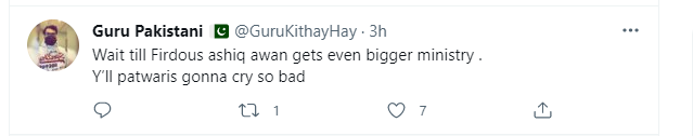 ٹوئٹر ہینڈل گرو پاکستانی لکھتے ہیں کہ ’اس وقت تک انتظار کریں جب فردوس عاشق اعوان اس سے بھی بڑی وزارت پر ہوں گی۔‘