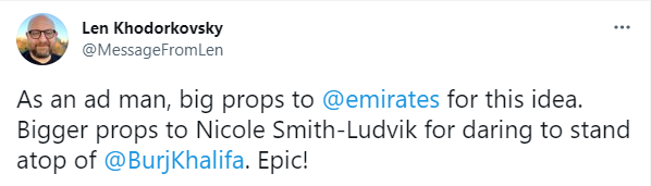 لین خودروسکی نامی ٹویپ نے لکھا ’اشتہارات سے متعلق فرد کے طور پر ایمریٹس کے اس آئیڈیا کے لیے بہت سا احترام۔ نکول سمتھ لوڈوک کو بہادری سے برج خلیفہ کی چوٹی پر رہنا بھی قابل ستائش ہے۔‘