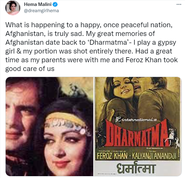 ہیمامالنی نے اپنی فلموں کا ذکر کیا اور افغانستان سے متعلق اپنی یادیں تازہ کیں تو لکھا ’فلم دھرماتما میں جپسی لڑکی کا کردار نبھایا تھا، فلم میں میرا کردار وہیں فلمایا گیا تھا۔ میرے والدین بھی اس موقع پر ہمارے ساتھ تھے اور فیروز خان نے ہمارا عمدہ خیال رکھا تھا۔‘
