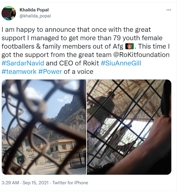 افغان خواتین فٹبال ٹیم کی کیپٹن خالدہ پوپل نے پاکستان اور افغانستان کے درمیان سرحد کی تصویر شیئر کرتے ہوئے ٹویٹ کیا کہ وہ 79 خواتین فٹبالرز اور ان کے خاندانوں کو افغانستان سے نکالنے میں کامیاب ہوئی۔