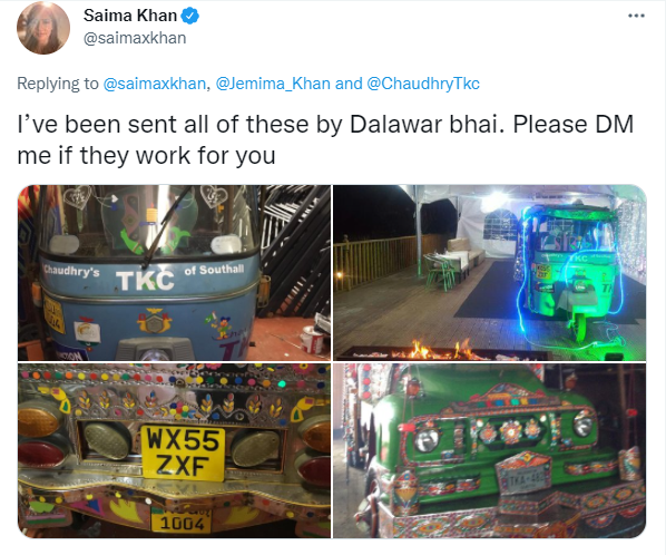 پاکستانی کرکٹر شاہد آفریدی کی فاؤنڈیشن سے تعلق رکھنے والی صائمہ خان نے ساؤتھ ہال میں پاکستانی و چینی کھانے فراہم کرنے والے ایک ریستوران میں رکشے کی موجودگی کی اطلاع دی تو جواب میں جمائما خان کا کہنا تھا کہ انہیں ’لاہور سٹائل کا سجا ہوا‘ رکشہ درکار ہے۔