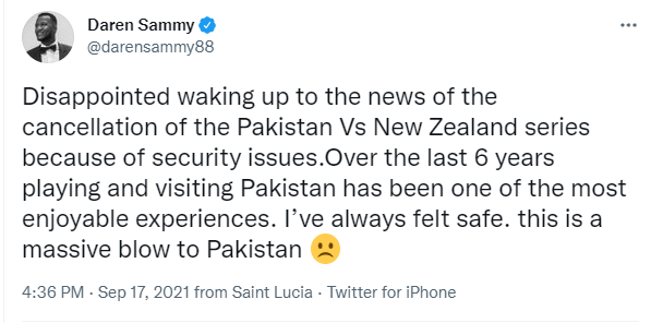 ویسٹ انڈیز کے سابق کپتان ڈیرن سیمی نے بھی نیوزی لینڈ کے اس فیصلے پر مایوسی کا اظہار کرتے ہوئے لکھا کہ ’پچھلے چھ سالوں میں پاکستان جانا اور کرکٹ کھیلنا ایک خوشگوار تجربہ رہا ہے۔‘