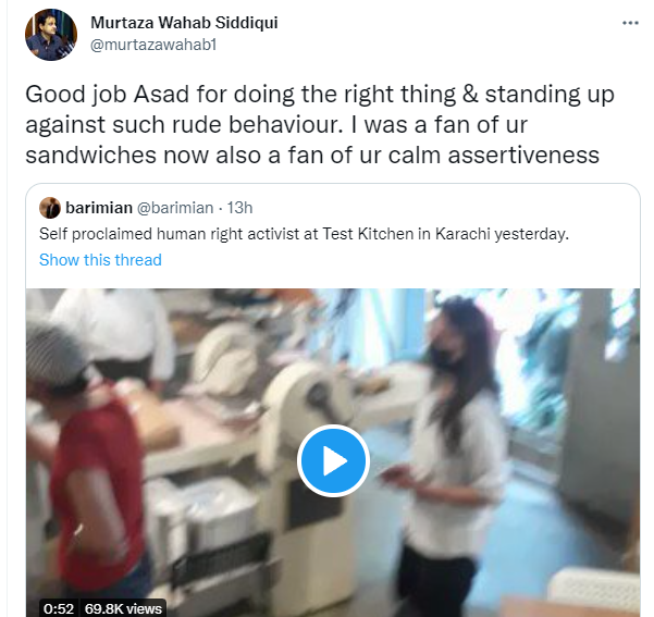 سندھ حکومت کے ترجمان مرتضی وہاب صدیقی نے اپنے تبصرے میں خاتون کے ’خراب رویے‘ کے باوجود ’نرمی سے اصرار جاری رکھنے‘ پر اسد کو سراہا تو لکھا ’میں آپ کے سینڈویچ کا فین تھا ہی اب نرم مزاجی کا قائل بھی ہو گیا ہوں۔‘