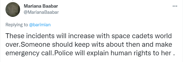 ماریانہ بابر نامی ٹویپ نے ایسے واقعات میں اضافے کا امکان ظاہر کیا تو لکھا کہ ’کسی کو ایسے موقع پر ایمرجنسی کال کرنی چاہیے، پولیس اسے ہیومن رائٹس سمجھائے گی۔‘