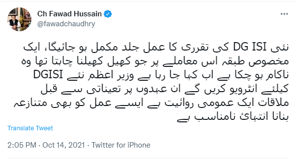 انہوں نے کہا کہ ’اب یہ کہا جا رہا ہے کہ وزیر اعظم نئے ڈی جی آئی ایس آئی کا انٹرویو کریں گے ان عہدوں پر تعیناتی سے قبل ملاقات ایک عمومی روایت ہے ایسے عمل کو بھی متنازع بنانا انتہائی نامناسب ہے۔‘