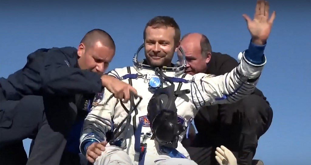 عملے کو زمین پر خلاباز اولیگ نویتسکی واپس لے کر آئے ہیں۔ فوٹو: اے ایف پی