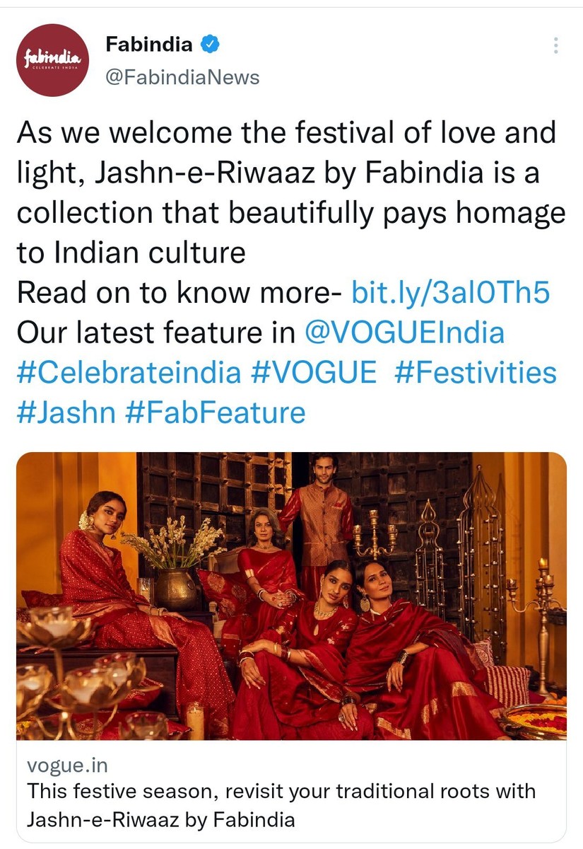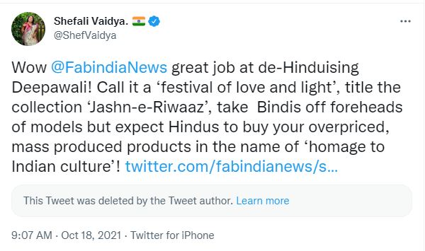 اس حوالے سے شفالی ویدیا نے لکھا کہ ’فیب انڈیا‘ نے ہندوؤں کے مذہبی فیسٹول کو غیرہندو بنانے کی کوشش کی ہے۔