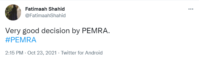 ٹوئٹر صارف فاطمہ شاہد نے لکھا کہ ’پیمرا کا بہت اچھا فیصلہ۔‘