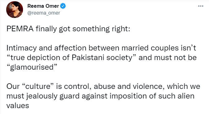 انسانی حقوق کی کارکن ریما عمر نے طنز کرتے ہوئے ٹویٹ کی کہ ’آخر کار پیمرا کو کچھ صحیح مل گیا۔ شادی شدہ لوگوں میں پیار اور محبت ہمارے معاشرے کا اصل چہرہ نہیں ہیں اور انہیں بڑھا چڑھا کر پیش نہیں کرنا چاہیے بلکہ ہماری ثقافت میں تشدد اور کنٹرول شامل ہے جس کی ہمیں ہر ممکن حفاظت کرنی چاہیے۔‘