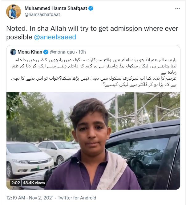 ان کی اس ویڈیو پر اسلام آباد کے ڈپٹی کمشنر محمد حمزہ شفقات نے کہا تھا کہ وہ اس بچے کو کسی سکول میں داخلہ دلانے کی کوشش کریں گے۔