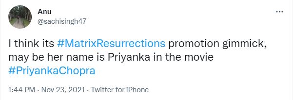 ایک اور صارف نے لکھا کہ ’میرے خیال میں یہ میٹرکس: ریسریکشن کی پروموشن کے لیے ہو رہا ہے، شاید ان کا نام اس فلم میں پریانکا ہو۔‘