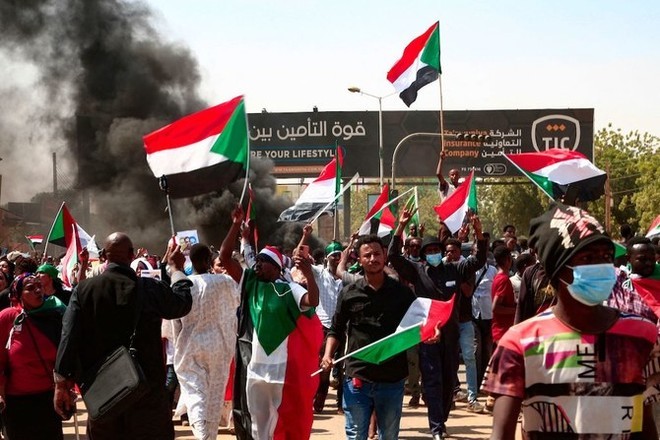 سوڈانی پرچم لہراتے ہوئے مظاہرین نے سوڈان کے فوجی رہنما عبدالفتاح البرہان کے خلاف نعرے لگائے۔ ہوئے برہان ہم تمہاری حکومت نہیں چلنے دیں گے۔ اپنی فوجی حکمرانی ختم کرو۔