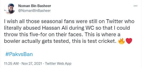 ایک صارف نعمان بن بشیر تو آج بھی غصے میں نظر آئے لیکن یہ غصہ حسن علی نہیں بلکہ ان کے ناقدین کے لیے تھا۔