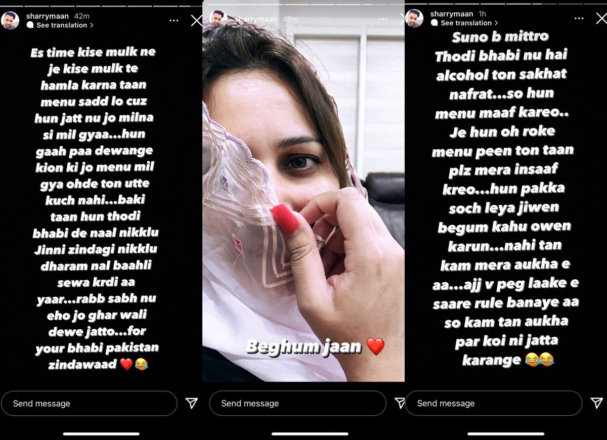 انہوں نے ایک اور انسٹا سٹوری میں اپنی اہلیہ کی تصویر شیئر کی اور ساتھ ہی ایک اور پوسٹ میں لکھا کہ ’اس وقت اگر کسی ملک نے کسی دوسرے ملک پر حملہ کرنا ہے تو مجھے بلا لے کیونکہ جٹ کو جو ملنا تھا وہ مل گیا۔‘
