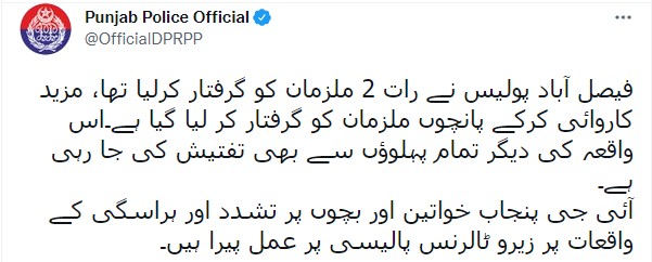منگل کی شام پنجاب پولیس کے آفیشل ٹوئٹر ہینڈل سے اطلاع دی گئی کہ فیصل آباد پولیس نے خواتین پر تشدد میں ملوث ملزمان کو گرفتار کرلیا ہے۔