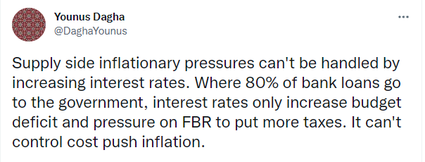 انہوں نے ٹویٹ کرتے ہوئے لکھا کہ جب بینکوں سے لیے جانے والے قرض کا 80 فیصد حکومت کو جاتا ہو تو شرح شود بڑھانے سے صرف بجٹ خسارہ بڑھے گا اور ایف بی آر پر مزید ٹیکس جمع کرنے کے لیے دباؤ میں اضافہ ہوگا۔