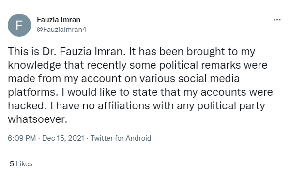 یہ ٹویٹ فوراً ٹوئٹر پر ٹاپ ٹرینڈ بن گئی اور اس کے تھوڑی دیر بعد اسی خاتون اسسٹنٹ پروفیسر سے منسوب ایک اور ٹوئٹر اکاؤنٹ کے ذریعے ٹویٹ کی گئی کہ ان کا ٹوئٹر اکاؤنٹ ہیک ہوگیا تھا۔