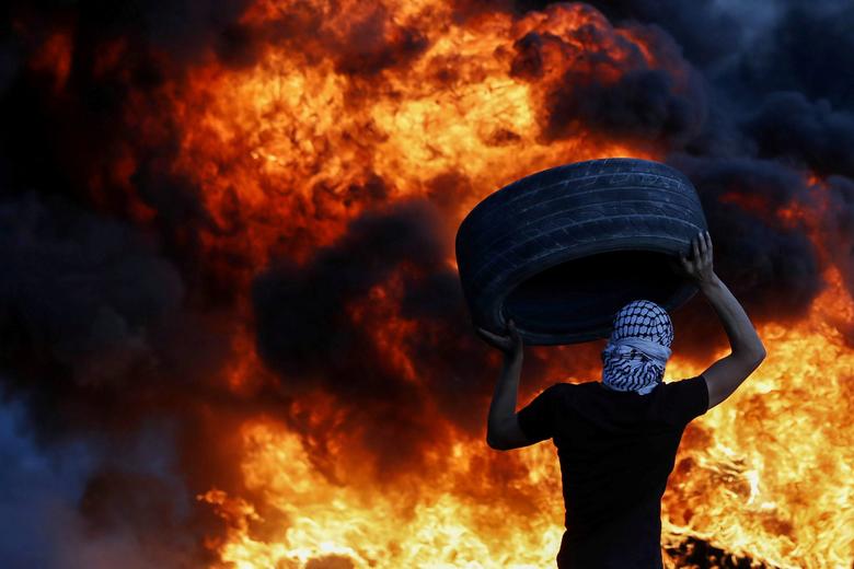 مغربی کنارے میں اسرائیل کے خلاف فلسطینیوں کی جانب سے احتجاج کا سلسلہ چلتا رہا، رات کے وقت ہونے والے ایسے ہی ایک مظاہرے احتجاج کرنے والوں نے ٹائرز کو نذر آتش کیا۔