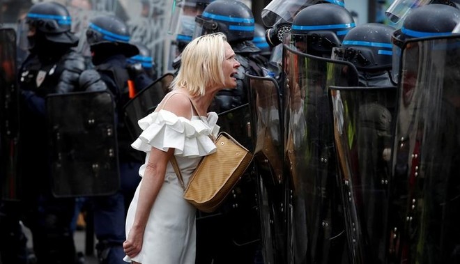 فرانس میں کورونا وائرس کی وبا پر قابو پانے کے لیے ہیلتھ پاسز کو لازمی قرار دیے جانے کے خلاف احتجاج کیا گیا (فوٹو: روئٹرز)