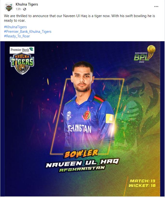 دوسری جانب بی پی ایل کی ٹیم کھلنا ٹائیگرز نے بھی تصدیق کی ہے کہ نوین الحق اس سیزن میں ان کی نمائندگی کریں گے۔