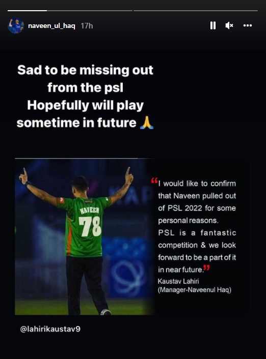 سوموار کو نوین الحق نے اپنے انسٹاگرام اکاؤنٹ سے اپنے مینیجر کا بیان پوسٹ کیا جس میں لکھا تھا کہ ’میں تصدیق کرنا چاہوں گا کہ نوین کچھ ذاتی وجوہات کی بنا پر پی ایس ایل نہیں کھیلں گے۔‘
