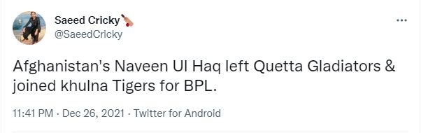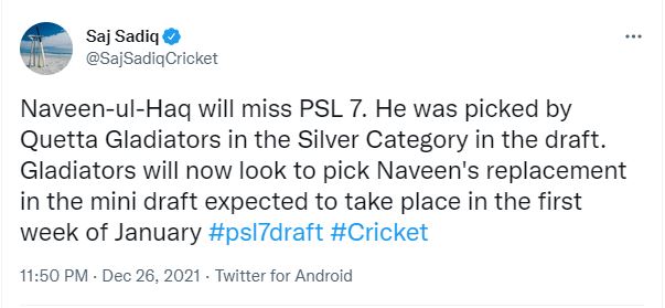 کرکٹ پر نظر رکھنے والی صحافیوں کا کہنا ہے کہ کوئٹہ گلیڈیٹرز کی ٹیم جنوری کے پہلے ہفتے میں ’منی ڈرافٹ‘ کے موقع پر نوین الحق کا متبادل کھلاڑی چننے گی۔
