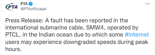 پی ٹی اے کے مطابق بین الاقوامی سب میرین کیبل ایس ایم ڈبلیو 4 میں خرابی سے رش کے اوقات میں صارفین کو انٹربیٹ سپیڈ میں کمی کا سامنا کرنا پڑ سکتا ہے۔
