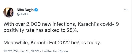 صارف نیہا داگیا لکھتی ہیں کہ کراچی میں دو ہزار نئے کیسز رپورٹ ہوئے ہیں اور مثبت کیسز کی شرح 28 فیصد پر پہنچ چکی ہے، لیکن دوسری طرف کراچی ایٹ 2022 آج سے شروع ہوگیا ہے۔
