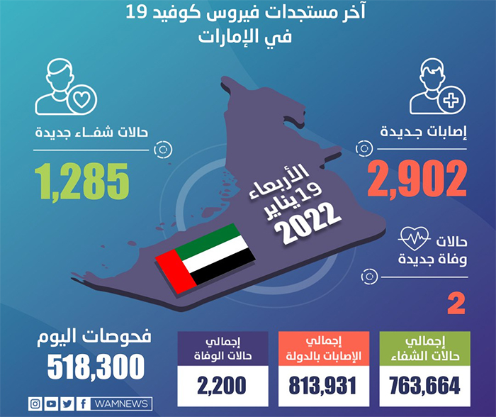 اماراتی خبررساں ایجنسی ’وام‘ نے وزارت صحت کے حوالے سے مزید کہا ہے کہ 2902 نئے کیسز ریکارڈ پر آئے ہیں جس کے بعد اب تک مریضوں کی مجموعی تعداد 8 لاکھ 13 ہزار 931 ہوچکی ہے-