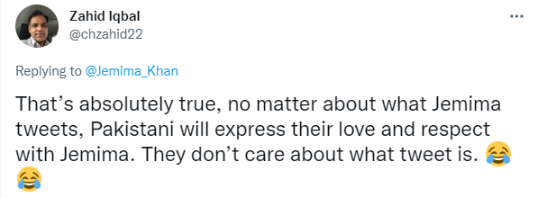 جمائمہ گولڈ سمتھ کے موقف کہ آئندہ ہر ٹویٹ پر ایسا ہی ہوگا سے اتفاق کرنے والے ٹویپس کا کہنا تھا کہ ’یہ سچ ہے۔ جمائمہ جو بھی کہیں پاکستانی یہ دیکھے بغیر کہ ٹویٹ کیا ہے، ان سے متعلق اپنی محبت اور احترام کا اظہار کرتے رہیں گے۔‘