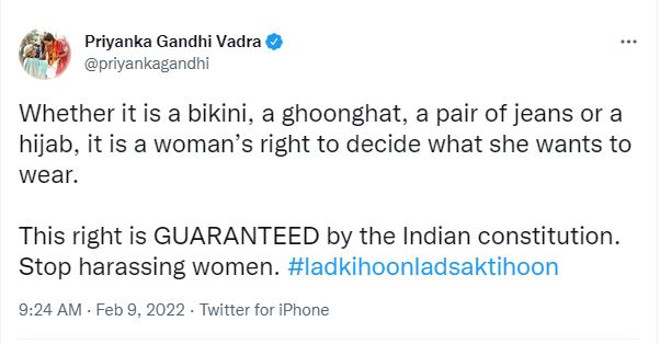 اپنی ایک ٹویٹ میں پریانکا گاندھی کا کہنا تھا کہ یہ ہر عورت کا حق ہے کہ وہ خود فیصلہ کرے کہ اسے کس قسم کا لباس زیب تن کرنا ہے۔ انہوں نے لکھا کہ یہ عورت کا حق ہے کہ وہ اپنی مرضی سے گھونگھٹ لے، جینز پہنے یا حجاب کا استعمال کرے۔