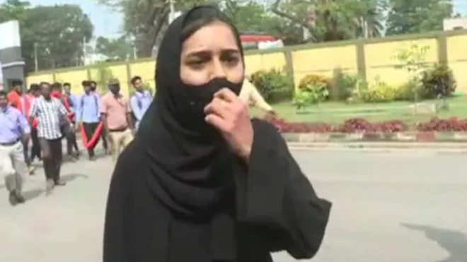 مسلمان طالبہ مسکان خان نے ’جے شری رام‘ کا نعرہ لگانے والے طلبہ کے جواب میں ’اللہ اکبر‘ کا نعرہ لگایا (فوٹو: سکرین گریب)