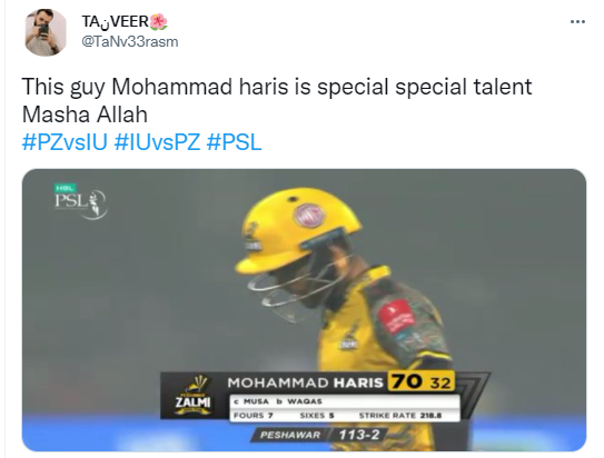 پشاور زلمی کے نوجوان کرکٹر محمد حارث نے پی ایس ایل سیون کی تیز ترین ففٹی بنائی اور سات چوکوں اور پانچ چھکوں کی مدد سے 32 گیندوں پر 70 رنز کی اننگز کھیلی۔