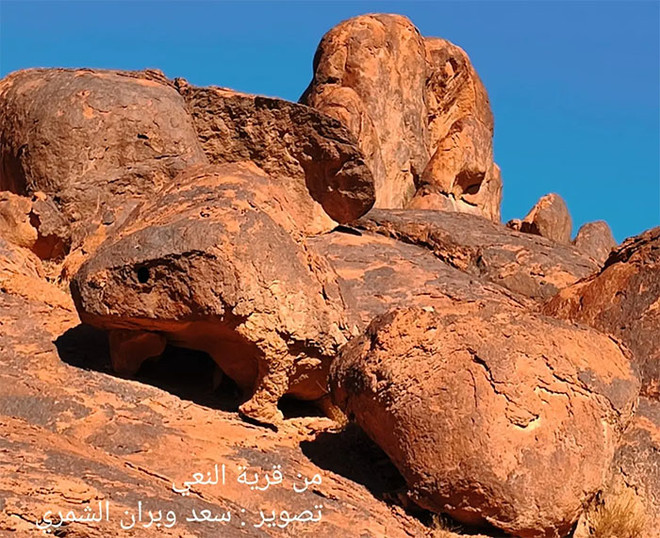 سعودی سیاح اور فوٹو گرافر سعد الشمری نے حائل ریجن کی الشنان کمشنری کے النعی قریے میں چٹانوں پر رینگنے والے جانوروں کی عجیب و غریب شکلیں دریافت کی ہیں۔