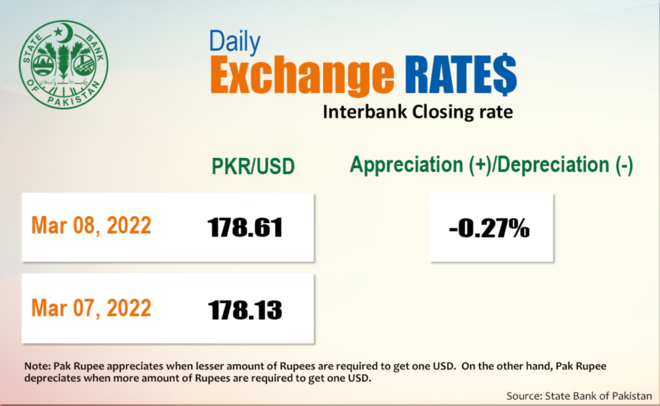 سٹیٹ بینک آف پاکستان کی جانب سے جاری کردہ انٹربینک مارکیٹ ایکسچینج ریٹس کے مطابق منگل کو روپے کے مقابلے میں ڈالر کی قدر میں 48 پیسے کا اضافہ ہوا جس کے بعد ڈالر کی نئی قیمت 178.61 روپے ہو گئی۔